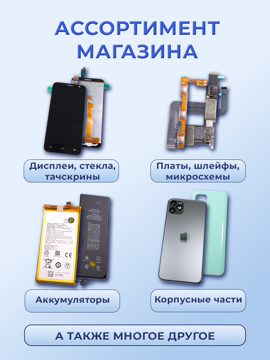 Интернет-магазин ART-GSM — специализированный поставщик запчастей и комплектующих для мобильных устройств с 2015 года. В нашем каталоге более 18 000 наименований в наличии на складе в Москве: дисплеи с тачскрином, аккумуляторы, задние крышки, тачскрины, шлейфы, камеры, корпуса, разъёмы зарядки, динамики и микрофоны, SIM-лотки, защитные стёкла, чехлы и сотни других позиций.